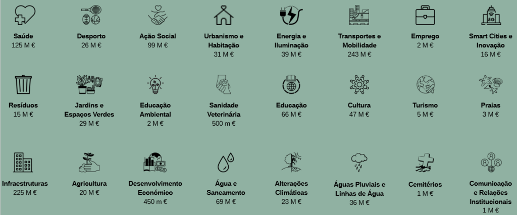 As áreas de atuação contempladas no portfólio incluem setores estratégicos para o crescimento sustentável do concelho, como saúde, educação, urbanismo e habitação, mobilidade e transportes, proteção civil, emprego, inovação e smart cities, infraestruturas, energia e iluminação, desenvolvimento económico, agricultura, resíduos, espaços verdes, educação ambiental, sanidade veterinária, turismo, cultura, desporto e alterações climáticas. Estes projetos foram organizados de forma a garantir que cada iniciativa tenha impacto direto e mensurável na qualidade de vida da população e no desenvolvimento da economia local.